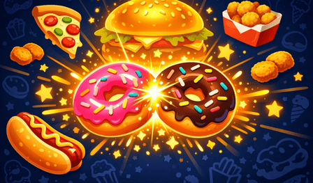 - Merge-Spiel im Watermelon-Stil: Lassen Sie identische Fast-Food-Artikel fallen, um größere zu erschaffen. Erbse → Nugget → Hot Dog → Pizza → Goldener Burger.